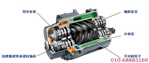 雙螺桿空壓機(jī)主機(jī)(又稱機(jī)頭)的結(jié)構(gòu)通常是由一對(duì)相互嚙合的齒輪(螺桿、主機(jī)殼體、高壓端及端蓋和低壓端及端蓋)組成。螺桿式空壓機(jī)主機(jī)正常運(yùn)行時(shí),螺桿與螺桿之間、螺桿與主機(jī)殼體及高低壓端面之間都是不接觸的(有微小的間隙由空壓機(jī)油來填充)。